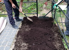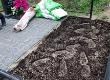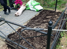 На данной могиле клиент решил высадить многолетний газон и обратился к нам за помощью. Осмотрев могилу, мы сразу же принялись за работу: первым делом насыпали на приготовленное под живые насаждения место слой новой, плодородной почвы.
